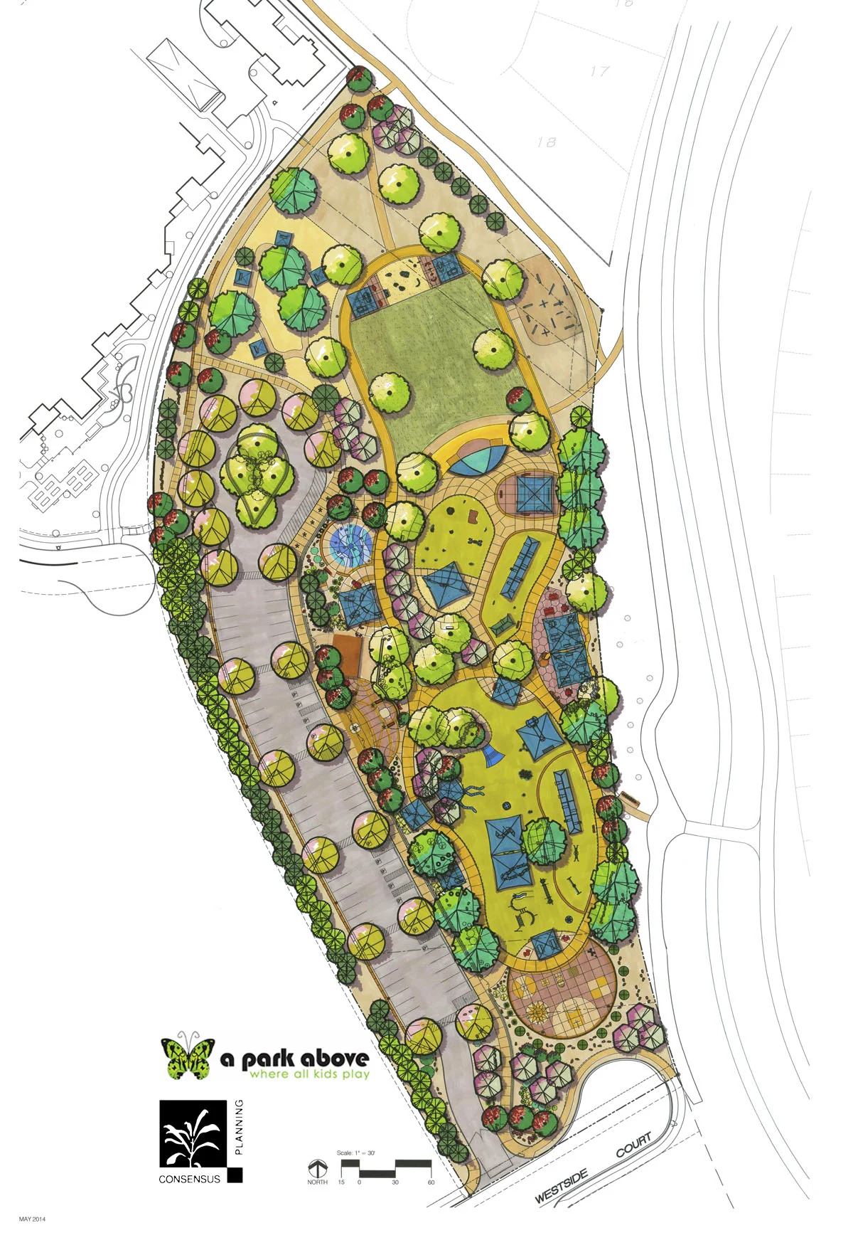 These ideals set the visionary goals for A Park Above: A Place Where All Kids Play! This is a park for all people, young and old, and of all abilities. A combination park and playground, the landscaped, sloping site will be fully accessible and will include fun and therapeutic play experiences designed to meet typical playground expectations as well as the needs of people with sensory, developmental, cognitive, and physical disabilities as well as a combination of disabilities. Parallel, group, and/or solitary play needs are addressed for those visitors needing such accommodations. What sets this park above all other parks is the deliberate integration of play equipment, shade structures, furnishings, finishes, landscaping, and technology designed to address the senses for safe navigation and stimulation. Sensory stimulation is a key feature, so colorful, eye-catching objects for both form and function occur throughout the park and there is even an area dedicated to music play. The park design includes environments designed to accommodate a variety of play experiences to encourage socialization, creativity, and imaginative play. Multiple areas with numerous play equipment components offer slides (traditional and embankment styles), swings (traditional belts, bucket, adaptive molded, wheelchair platform, and group styles), climbers, spinners, rockers, balancing, tunnels, small skills play, sensory features, court and table games, and even a splashpad…and that’s just in Phase 1! Horseshoes and bocce courts, labyrinth, dog park, fitness circuit, and an amphitheater with custom A/V features are planned for Phase 2. Many of the play areas have synthetic surfacing with integrated anti-static technology. Numerous shaded areas for seating and gathering is essential to meet user needs and occurs throughout the park. All of the park’s features are connected via a wide loop path with painted edging; tactile edging is also provided to identify when approaching an active play area. Unlike most city parks, A Park Above will have bathrooms, which will also include adult size changing tables. The entire play area is surrounded by perimeter fencing with gates that feature accessible locking mechanisms. A parking lot, outside the fencing, provides 73 spaces, 25% of which are accessible spaces which supports the City’s desire to consider this park to be an outdoor community center. The park will serve as a common ground for all members of the community; a destination where people of all abilities can have fun, explore and discover, be challenged, and be safe in a beautiful outdoor environment.
